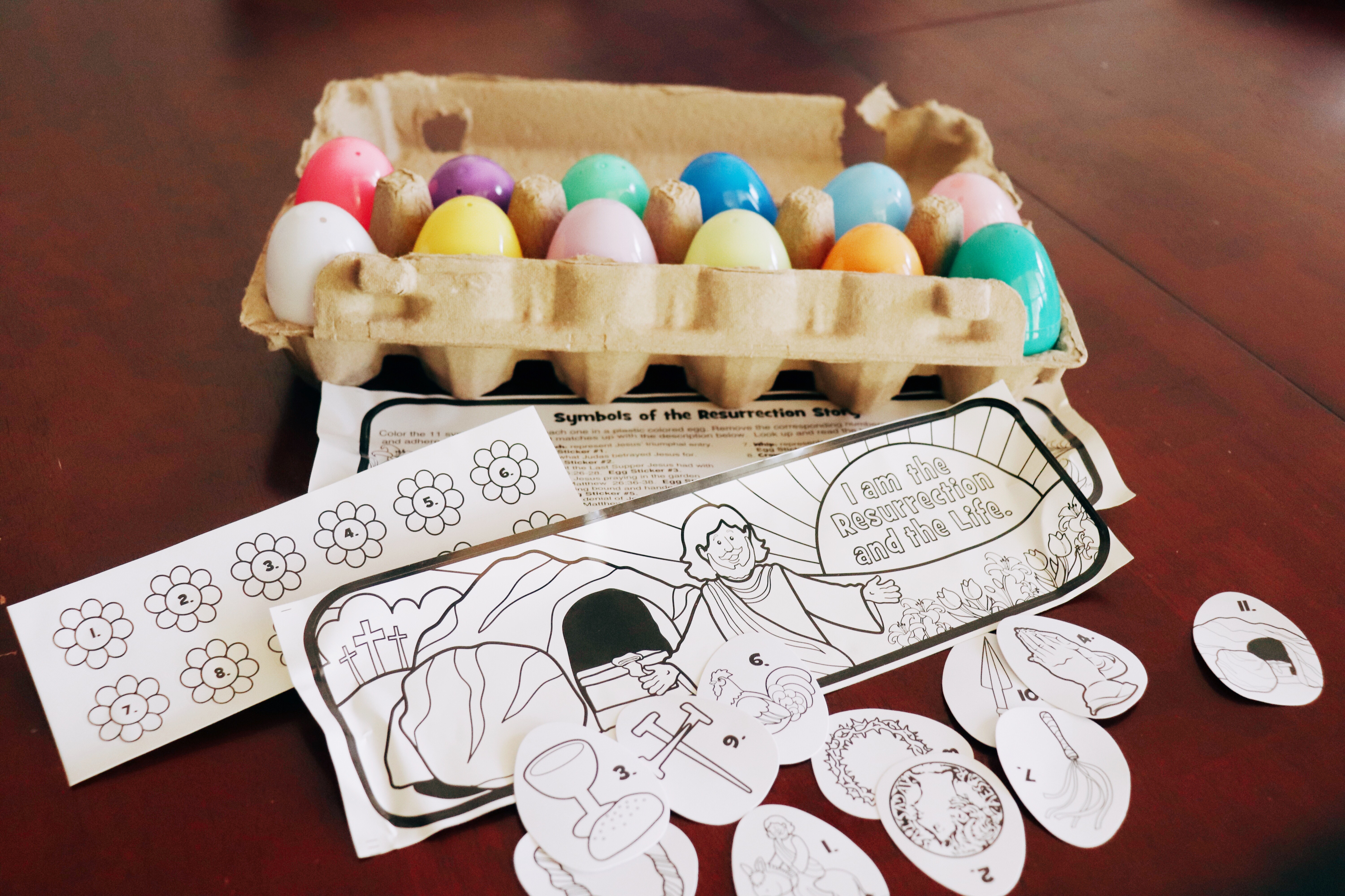 This year I found Resurrection Story Eggs and used the eggs to teach about Christ’s death on the cross and resurrection. The scriptures and pictures were helpful. We especially liked opening the empty egg because Jesus is not there, He is risen!